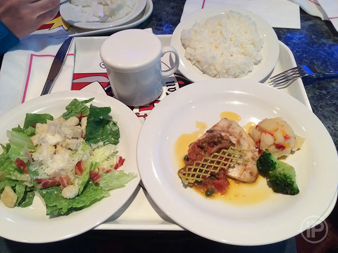 Кормят вкусно — есть традиционные салаты, вроде «Цезаря», есть по-разному приготовленное мясо, рис, есть какие-то непонятные японские блюда. В общем, мы выбрали более-менее понятную еду, чтобы не возникло казусов с пищеварением. Например, вот такой получился обед у меня:
