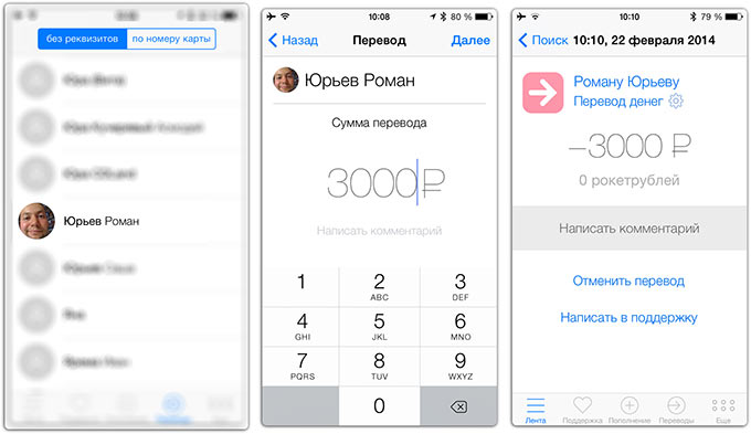 Во-вторых, процесс безналичных переводов для владельцев Рокетбанка максимально упрощен. Достаточно выбрать человека из своего списка контактов в iPhone. Никаких реквизитов, цифр и волокиты, только человек и номер его телефона из контактной книги