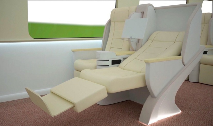 • 85 пассажирских мест сконструируют по системе «3+2»: кресла можно повернуть по направлению движения, в «первом классе» кресла вообще можно разложить и лечь, в остальных классах раскладываются под разным углом