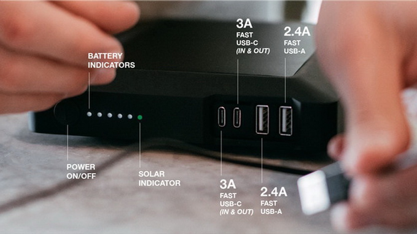 На борту 2 USB для зарядки по 2,4А, 2 USB-C для 3А и обычная розетка, 120/240 В. Правда, размеры «аккума» приближаются к iPad mini. Увы.