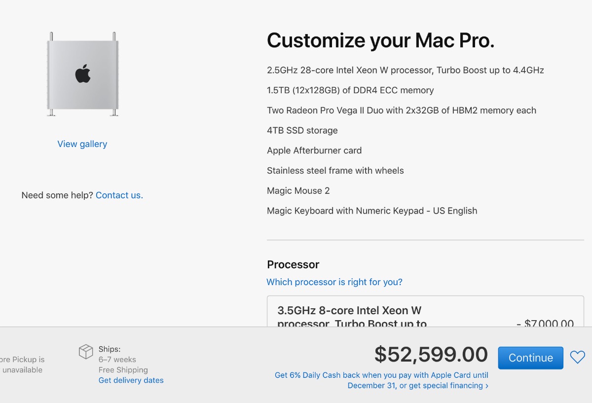 Сегодня стартовали продажи Mac Pro в США. Максимальная конфигурация стоит $52 599 или 3,3 млн руб. За эти деньги покупатель получает: