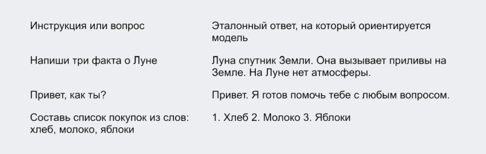 Вот примеры инструкций и эталонных ответов людей, на которые модель ориентируется во время тонкой настройки