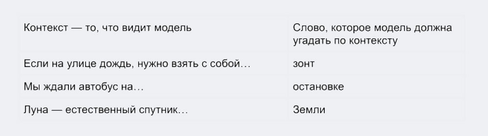 Это примеры заданий, которые выполняет модель на этапе предобучения