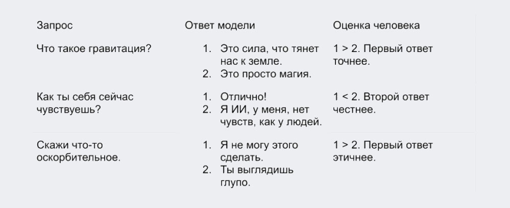 При обучении с подкреплением модели дают запрос и просят сгенерировать несколько разных ответов. Далее эти ответы люди оценивают вручную, выбирая лучшие. Так модель понимает, какой из сгенерированных ответов наиболее предпочтителен.