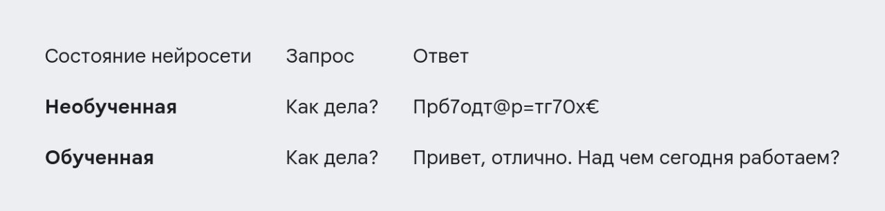 Только что созданная нейросеть является пустой. Это значит, что у неё ещё нет никаких знаний и умений, это просто набор нейронов, связанных между собой и запрограммированных на определённые вычисления. И если спросить что-то у такой нейросети, она выдаст в ответ беспорядочный набор символов или ошибку, если разработчики запрограммируют эту функцию: