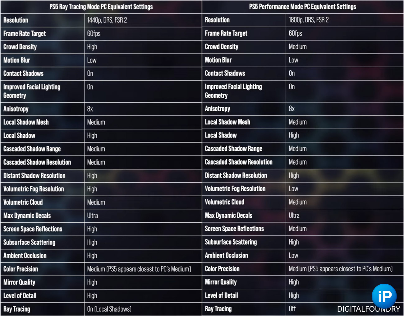 В обоих случаях графика на PS5 соизмерима со средне-высокими настройками на ПК c той лишь разницей, что в режиме трассировки лучей используются трассированные тени, высокая плотность толпы вместо средней, более качественный туман и выше разрешение масштабирования.