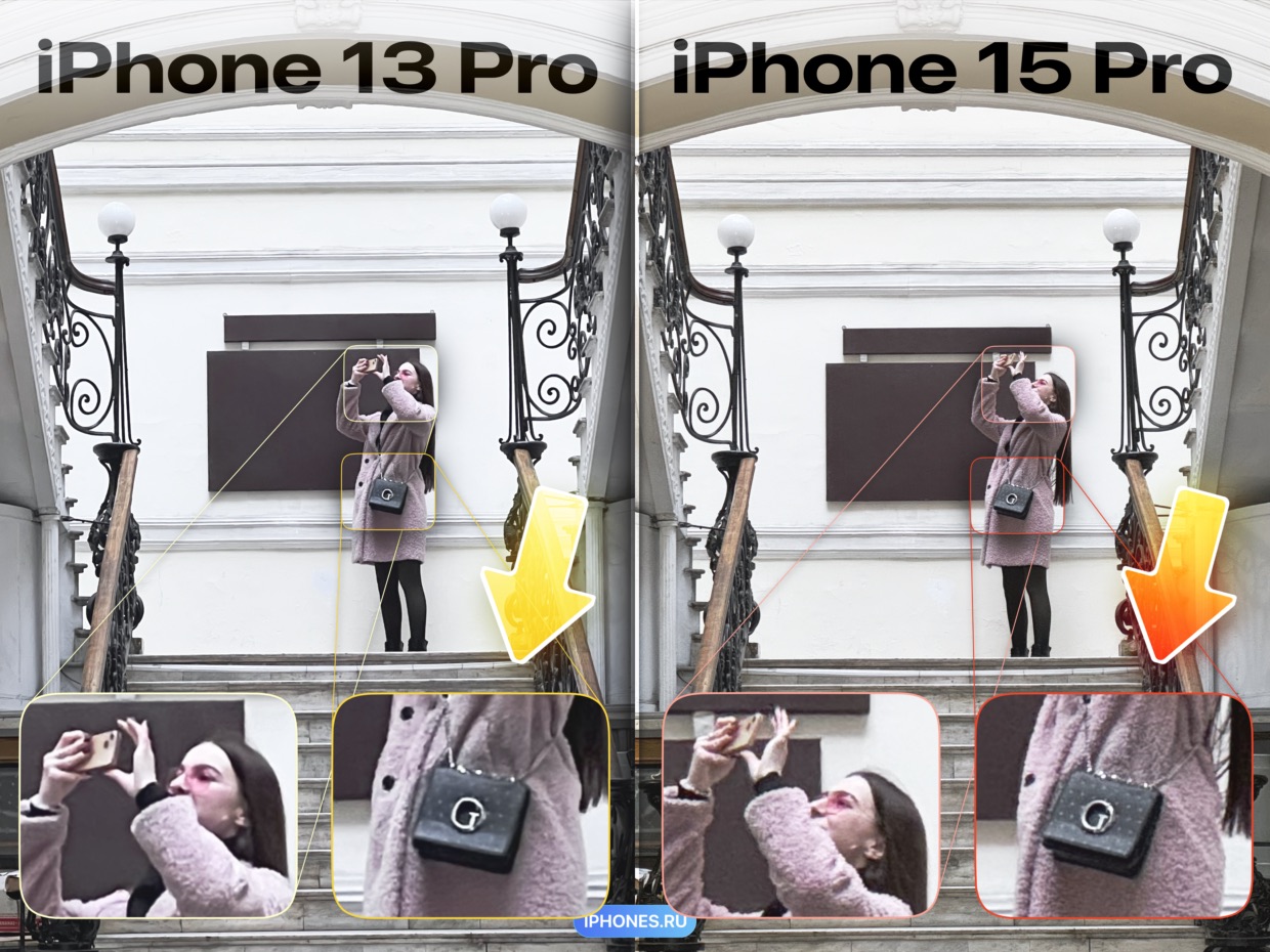 Не считая совсем на каплю более чувствительного на детали сенсора, в iPhone 13 Pro и iPhone 15 Pro установлены абсолютно одинаковые камеры с трёхкратным увеличением: они равны в размере матрицы, светосиле объективов и составе их линз, который влияет на чёткость, особенно по краям. Поэтому любые заметные улучшения тут появились исключительно благодаря более быстрым операциям процессора.