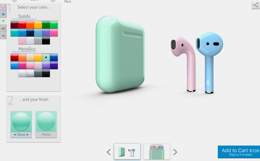 Есть в ассортименте компании и другие окраски AirPods. Разброс цен варьируется от $299 до $399. Поэкспериментировать с цветами можно на официальном сайте компании. [MR]