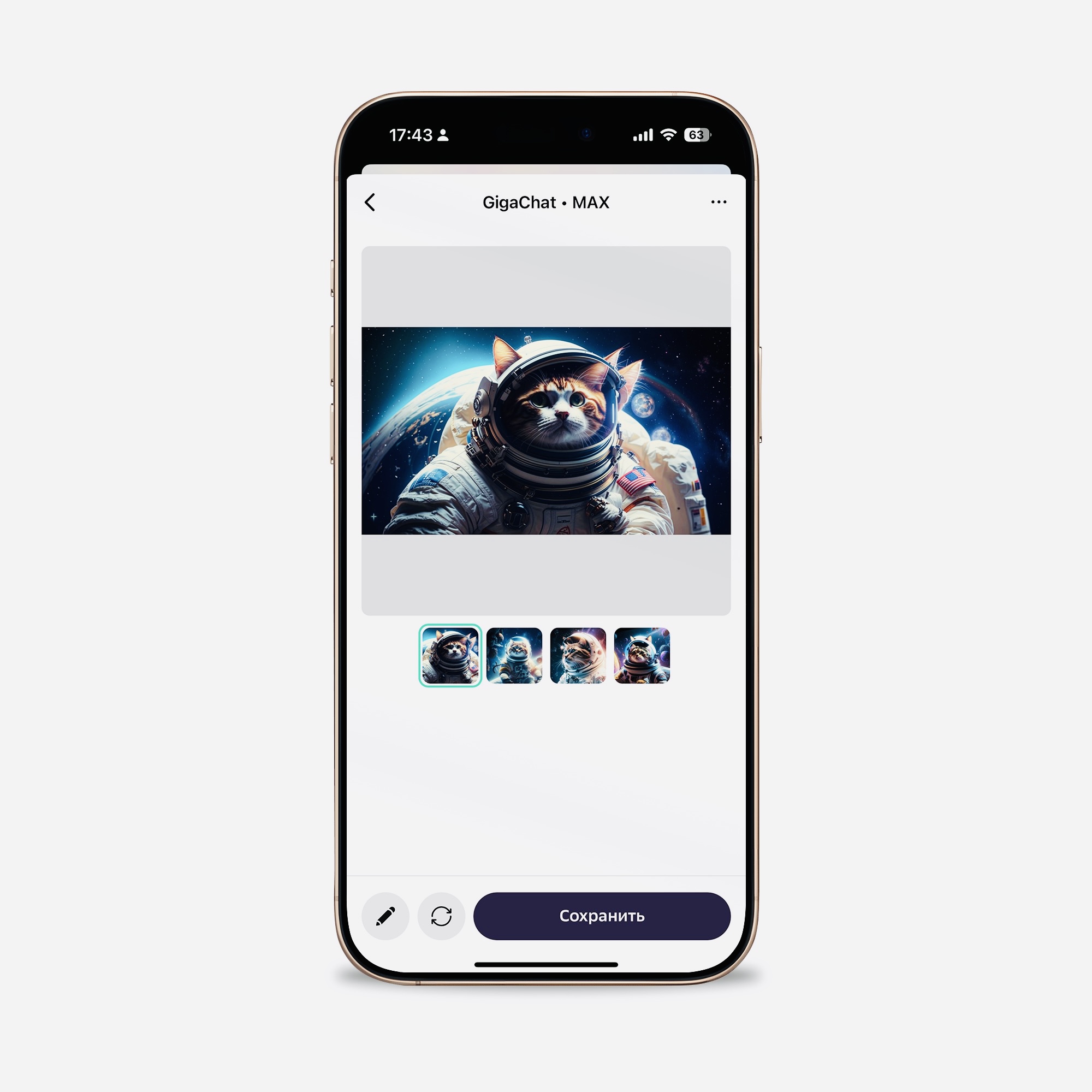 GigaChat пока не умеет вставлять текст в изображение. То есть «С днём рождения, Лена!» в голове есть, а на открытке какая-то каша.