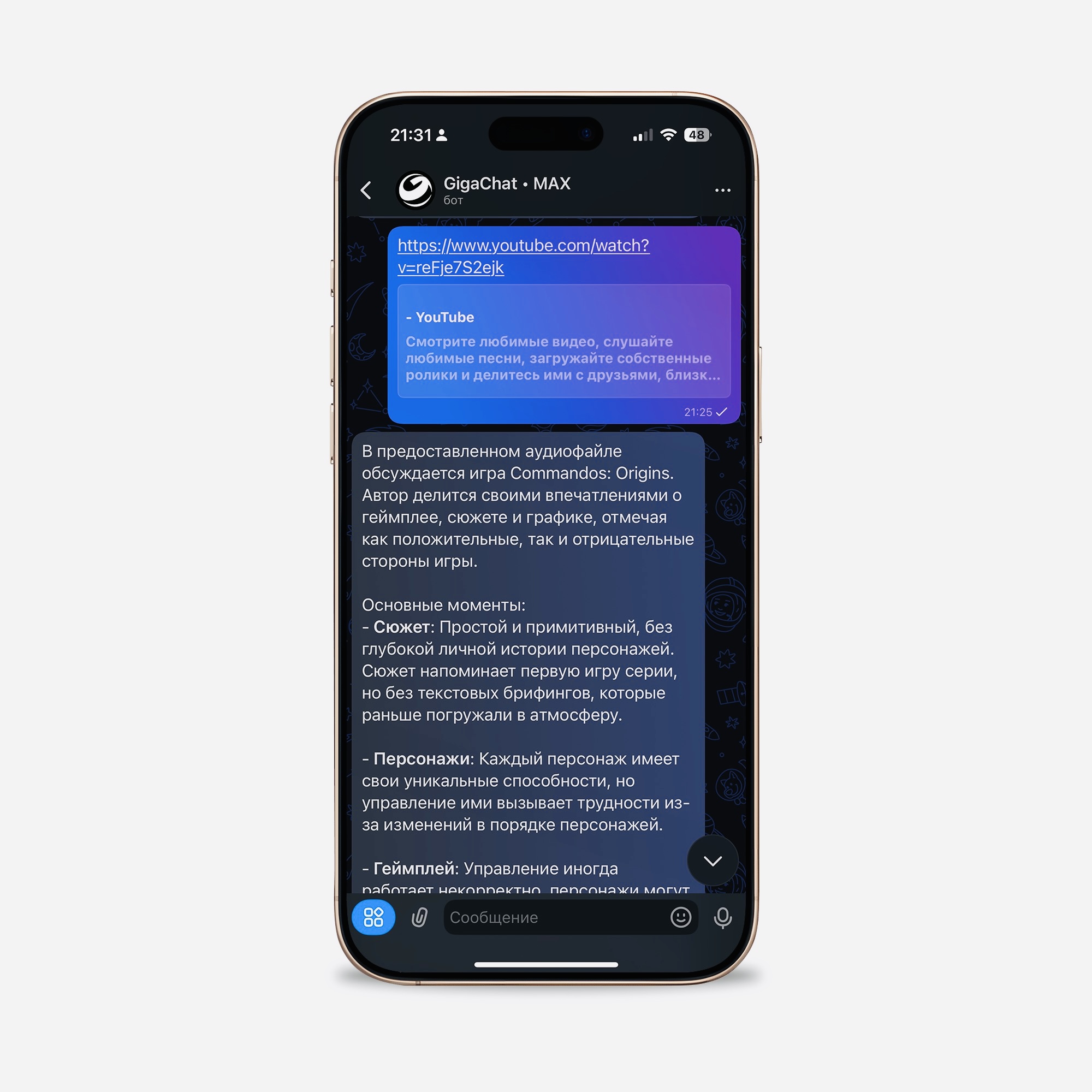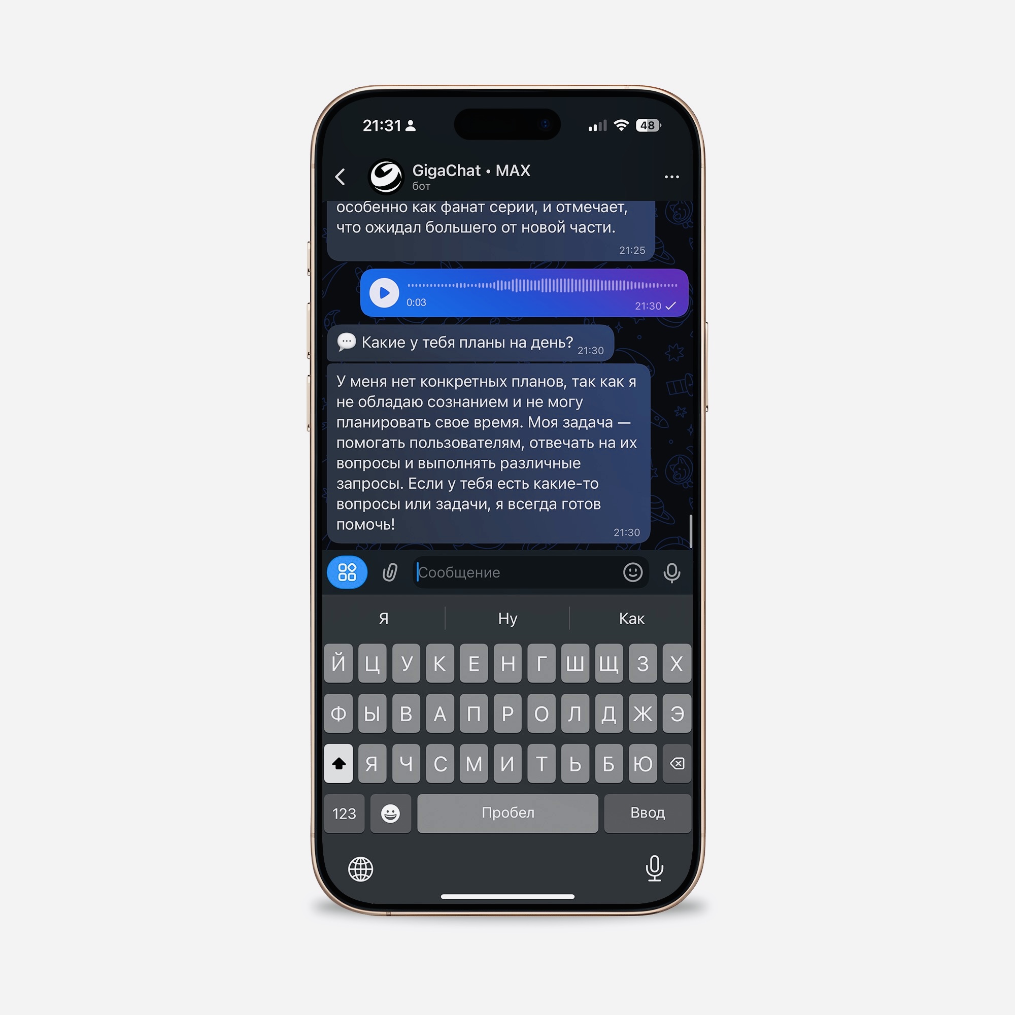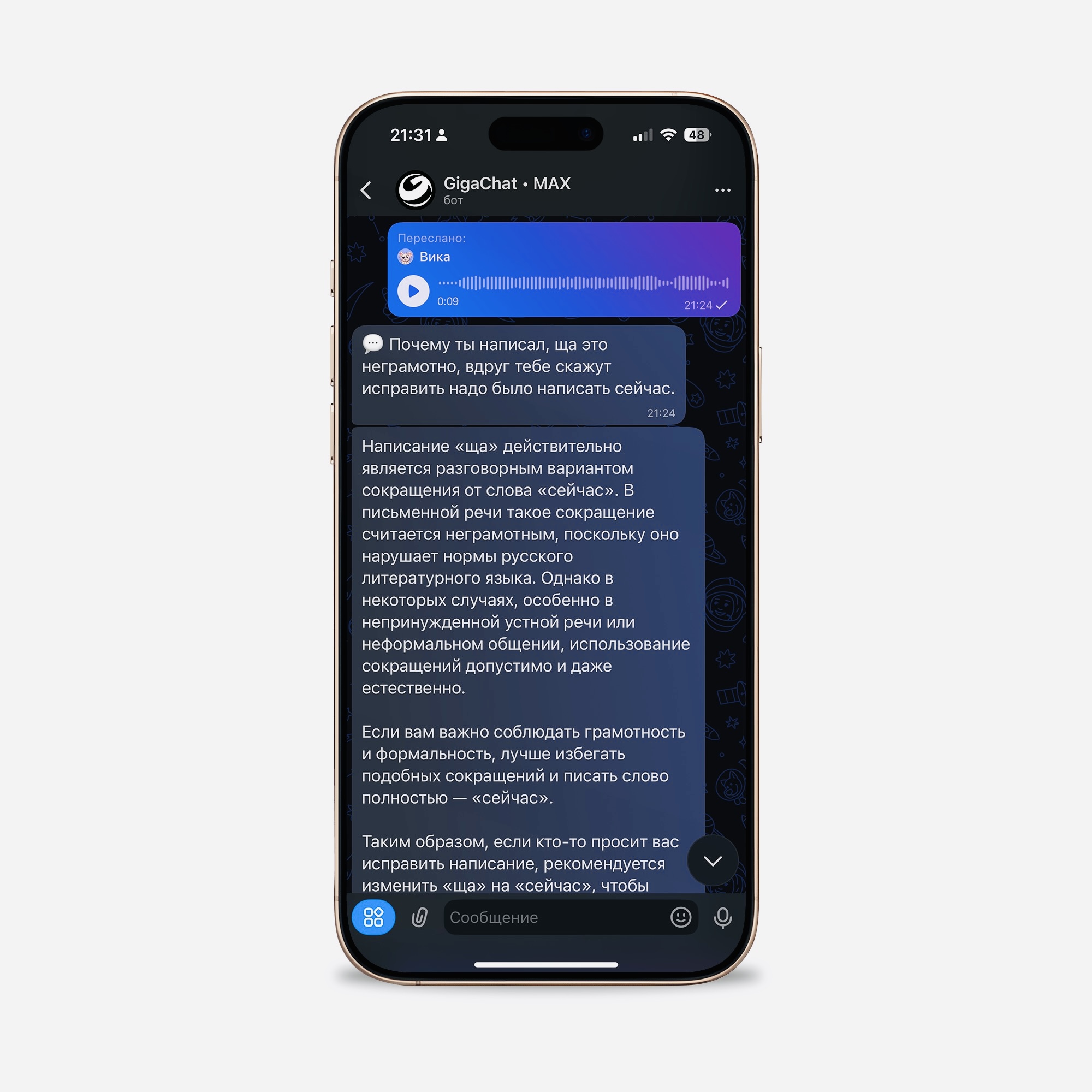По сути, GigaChat существует здесь параллельно: он использует MAX как канал доступа. Такой подход логичен для раннего этапа: он снижает порог входа, даёт аудитории возможность поэкспериментировать и собрать обратную связь.