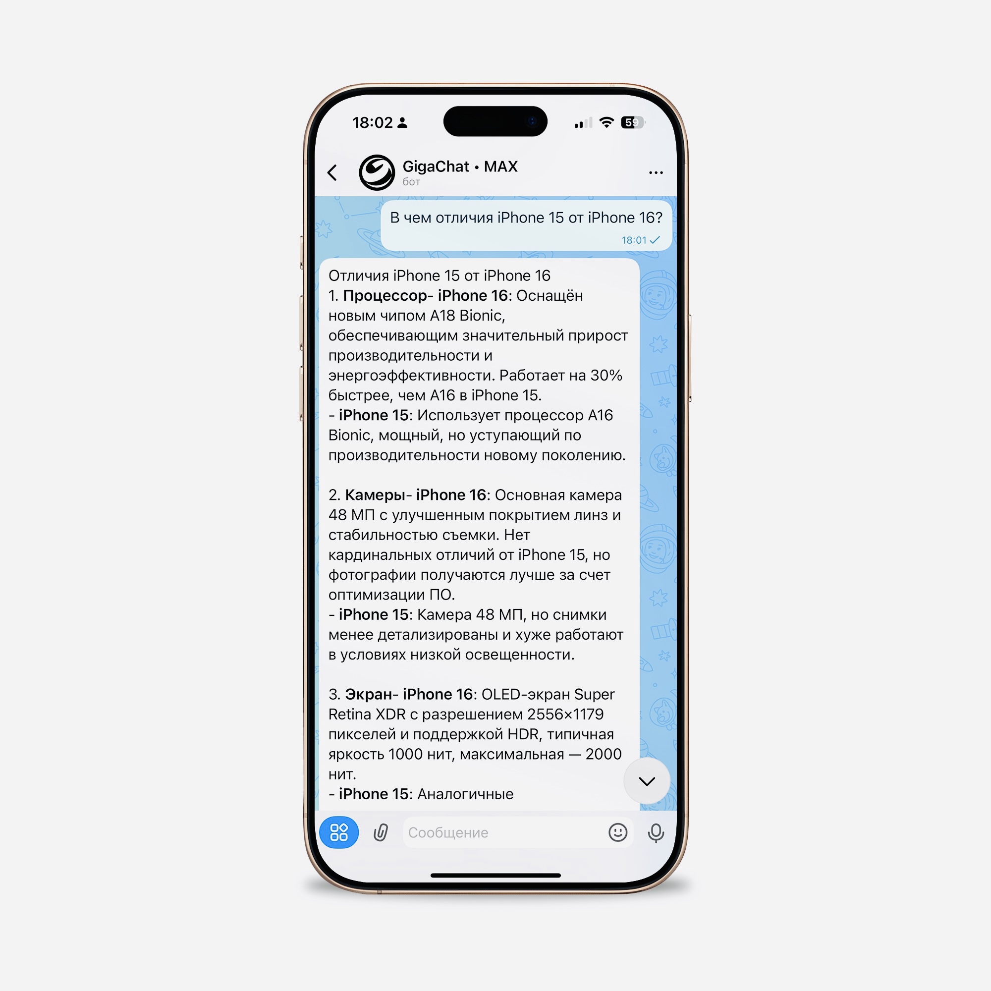 Сравнение: отличия iPhone 15 и iPhone 16. GigaChat разложил всё по пунктам: процессор, камера, экран. Указал, что A18 Bionic на 30% шустрее, чем A16. Обновления камеры и экрана тоже перечислил.