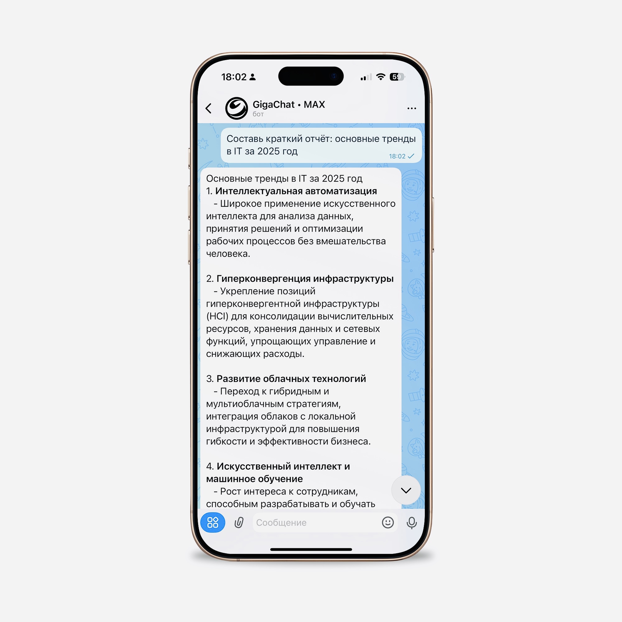 Краткий отчёт: основные тренды в IT за 2025 год. Выдал краткий список: ИИ повсюду, облака развиваются, обучение с помощью ботов. По каждому пункту есть короткий коммент, примеры, намёк на смысл.