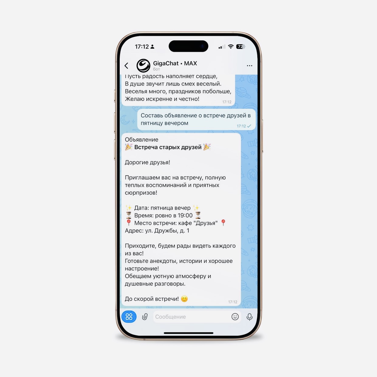 Объявление о встрече друзей. Получился тёплый и бодрый текст с emoji, призывом к веселью и всеми нужными данными. Видно, что бот в теме: он умеет быть дружелюбным, не перегибая в инфантильность.