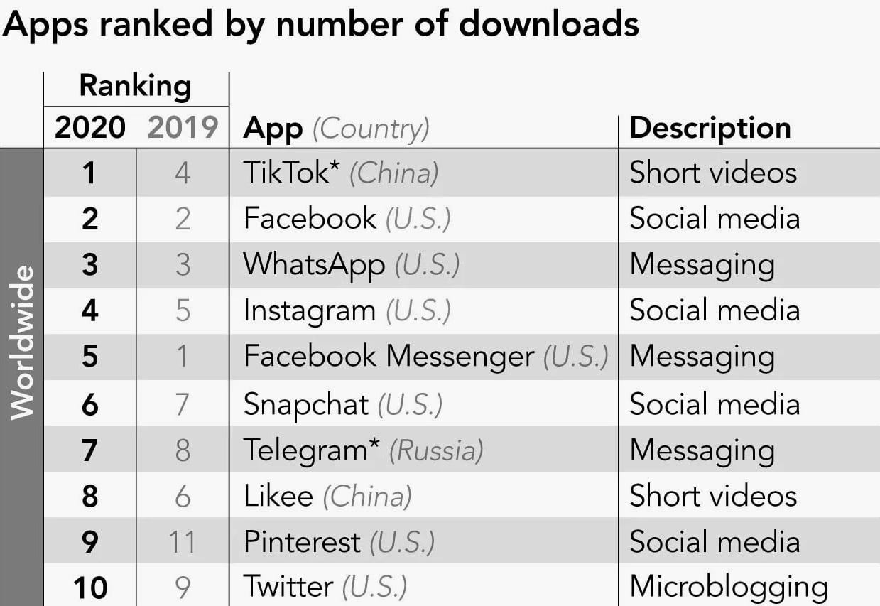 В 2020 году TikTok скачали более 3 миллиардов раз. Ранее этой отметки достигли только WhatsApp, Facebook и Instagram.