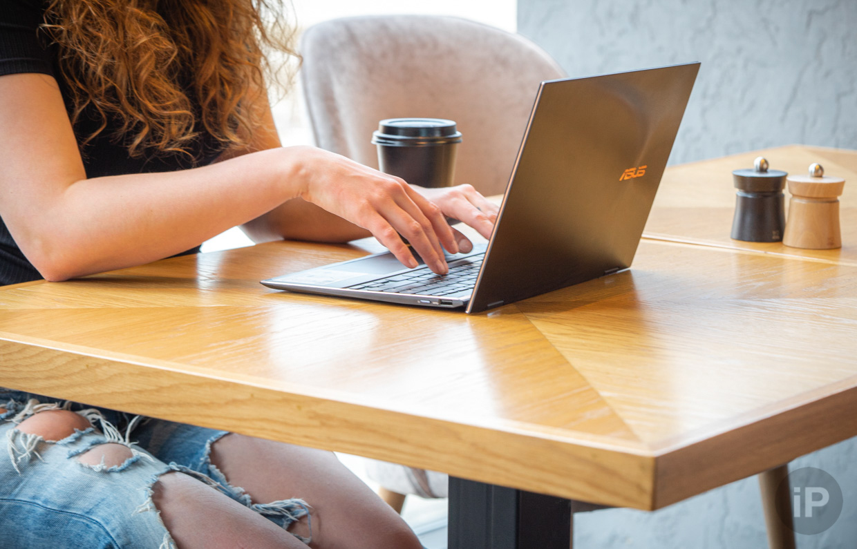 В такие моменты ZenBook Flip S можно поставить «домиком». Тут или экран будет к вам ближе, или место от клавиатуры будет свободным для ваших дел.