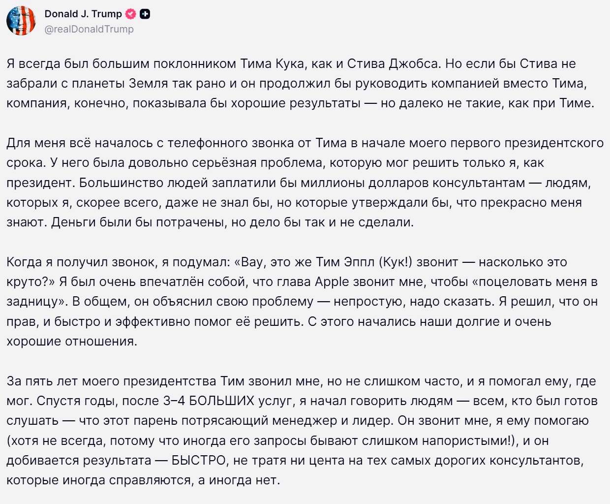В социальной сети Truth Social Дональд Трамп публично высказался о Тиме Куке и его роли в развитии Apple.