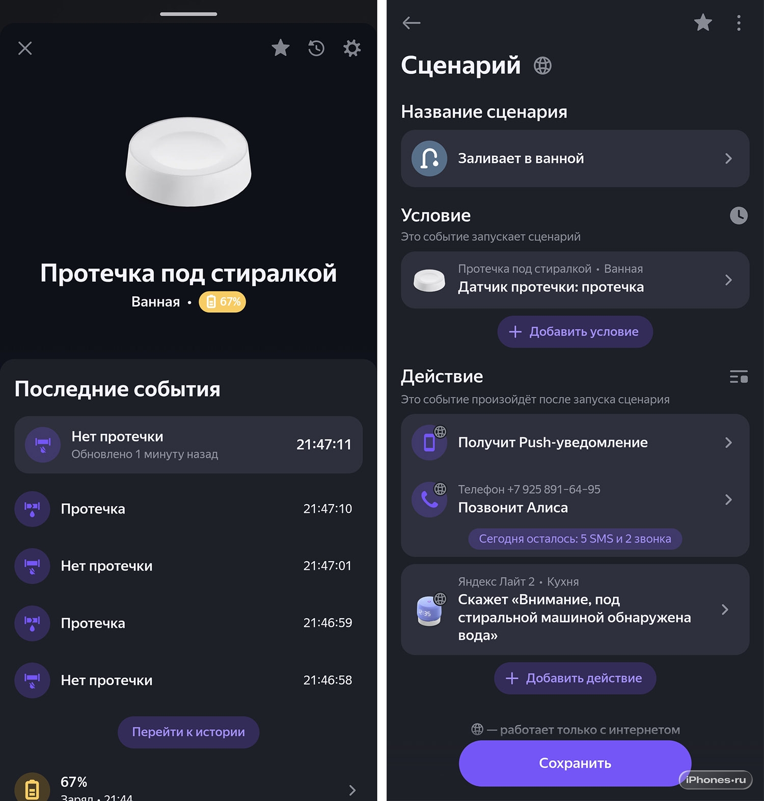 А если докупить умный кран с электроприводом, можно настроить сценарий, по которому вода в квартире будет автоматически перекрываться при аварии.