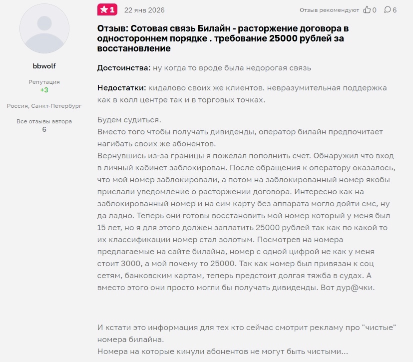История про номер, который был у человека 15 лет. Он вернулся из-за границы, попытался пополнить счет, а у него личный кабинет заблокирован, потом выясняется, что номер заблокировали, договор расторгли (причем уведомление якобы прислали на заблокированный номер, ну да, логично). И дальше ему говорят: восстановим, но номер теперь “золотой”, готовьте 25 000 рублей. За восстановление своего же номера, Карл!