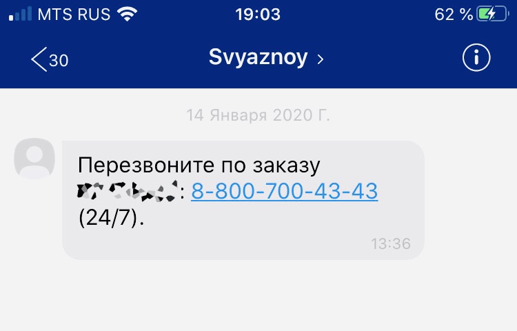 Спустя пару дней, 14 января поступает входящий звонок от Связного, но ответить я не успел, так как говорил по второй линии. Сразу как договорил, вижу сообщение в Viber: