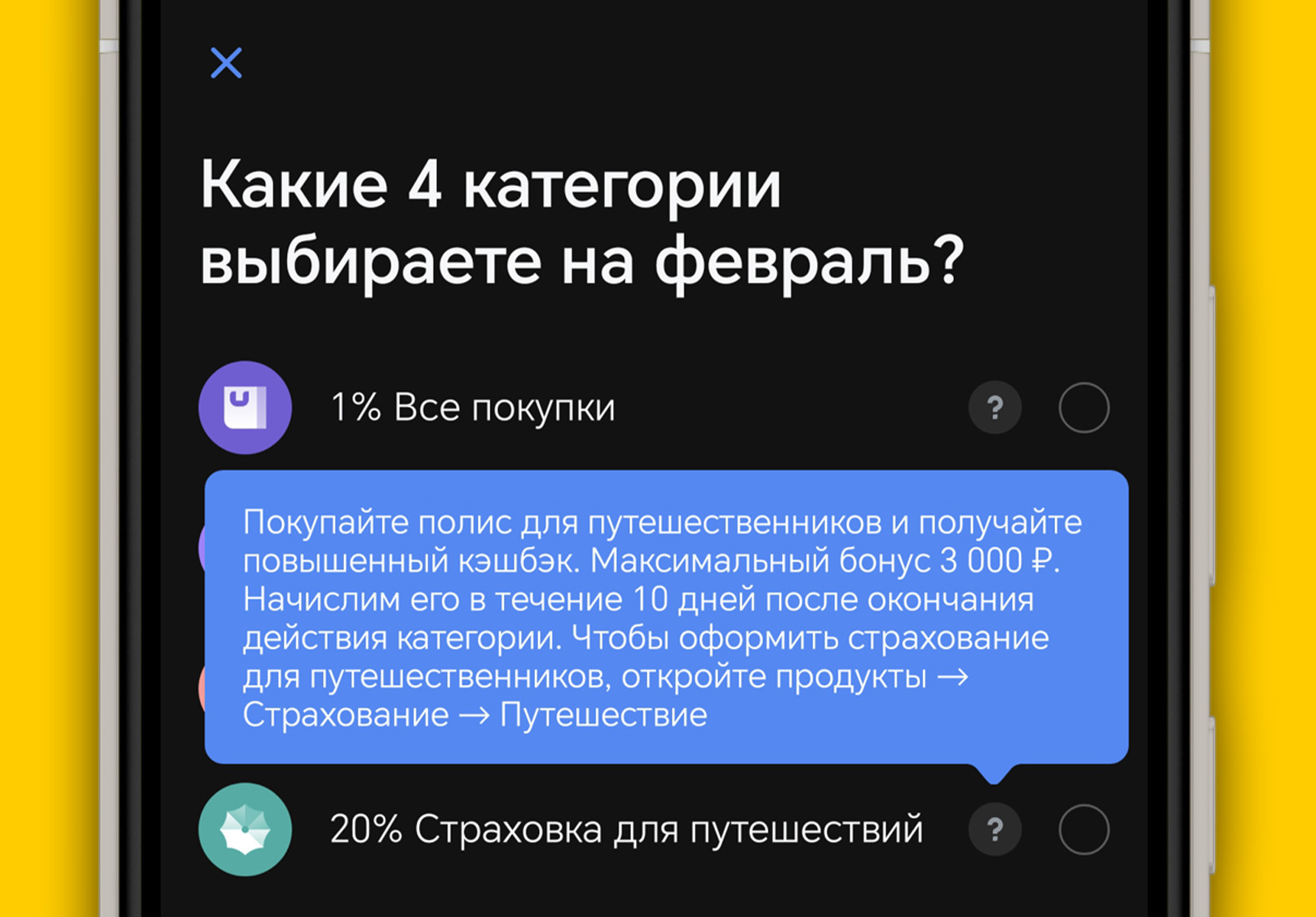 Каждый месяц и уже наверное год, а то и больше, мне подсовывают абсолютно бесполезные кэшбеки. Со скрипом на зубах пытаешься выбрать хоть что-то нужное. Причем первую из категорий ты в любом случае включать вынужден. То есть общий кэшбек в 1% это как бы тоже категория в понимании бывшего Тинькофф Банка.