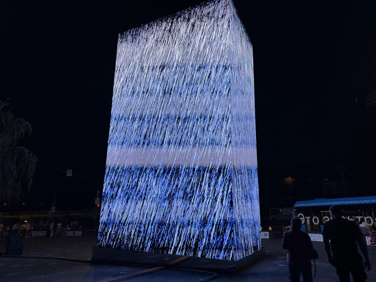 Но лично меня больше завораживали пиксельные столбы. Они меняют геометрию, рисунки и текстуру под музыку. Хорошее место, чтобы присесть на соседние скамейки и погрузиться в мысли.