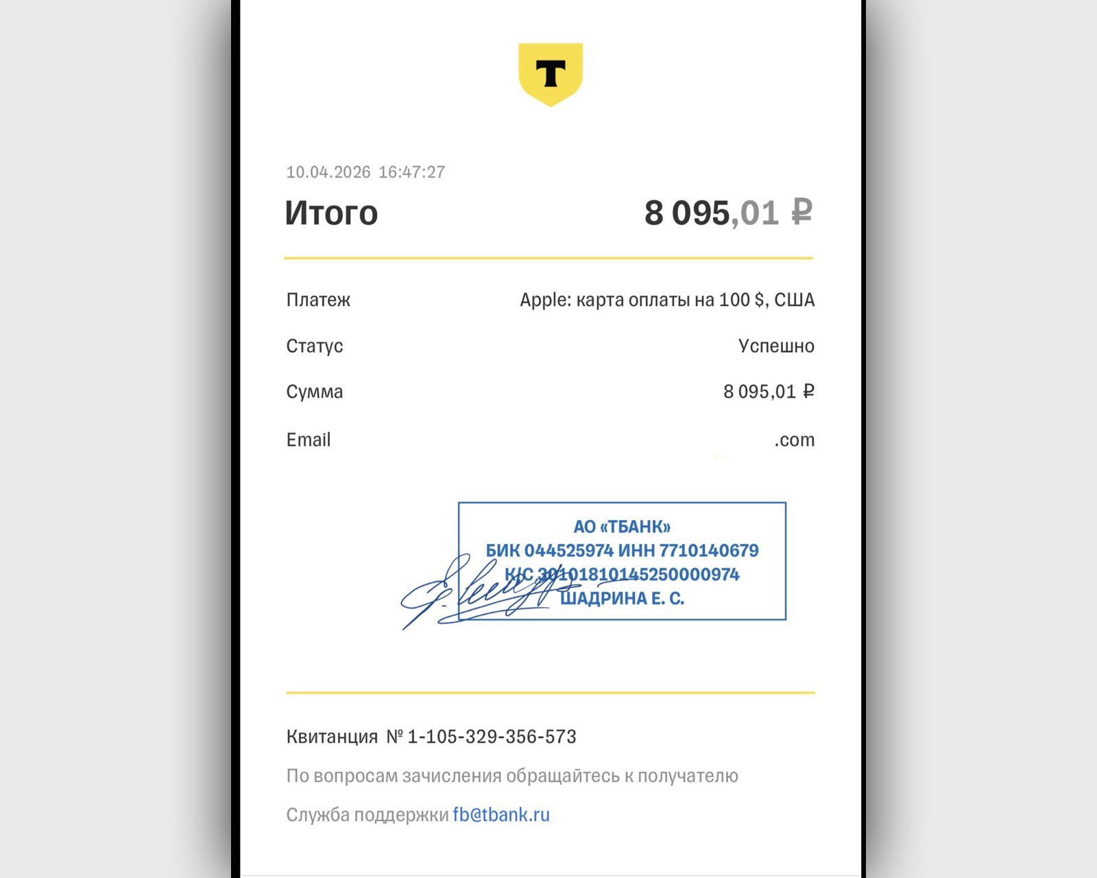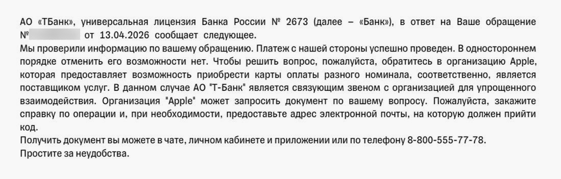 Ответ американской поддержки предсказуем: они продают свои подарочные карты только на официальном сайте Apple. Никакого отношения к российским банкам и их внутренним витринам они не имеют, и помочь мне с платежом, который я совершил в приложении Т-Банка, они физически не могут.