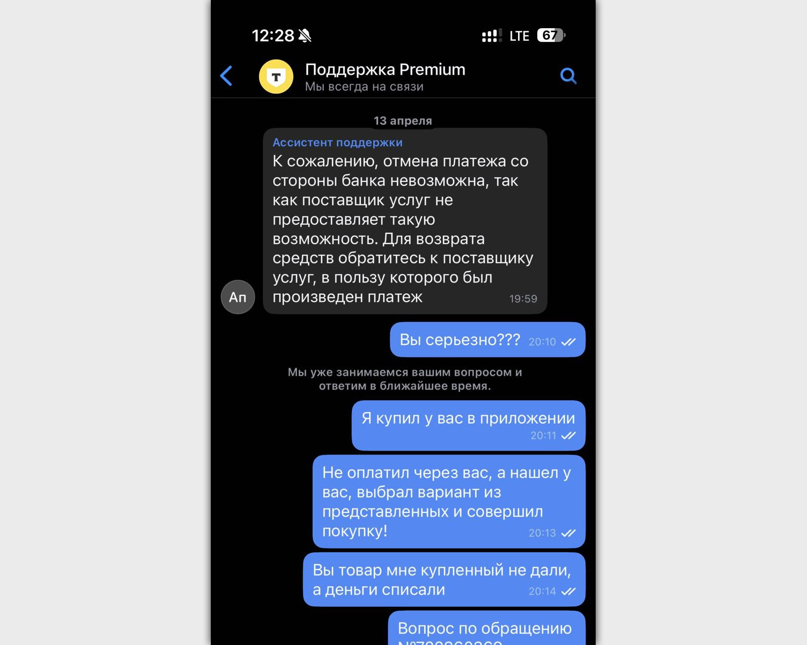 Подождав немного, я логично пошел разбираться в поддержку банка. Благо, у меня был подключен сервис Premium. Дальше цирк.