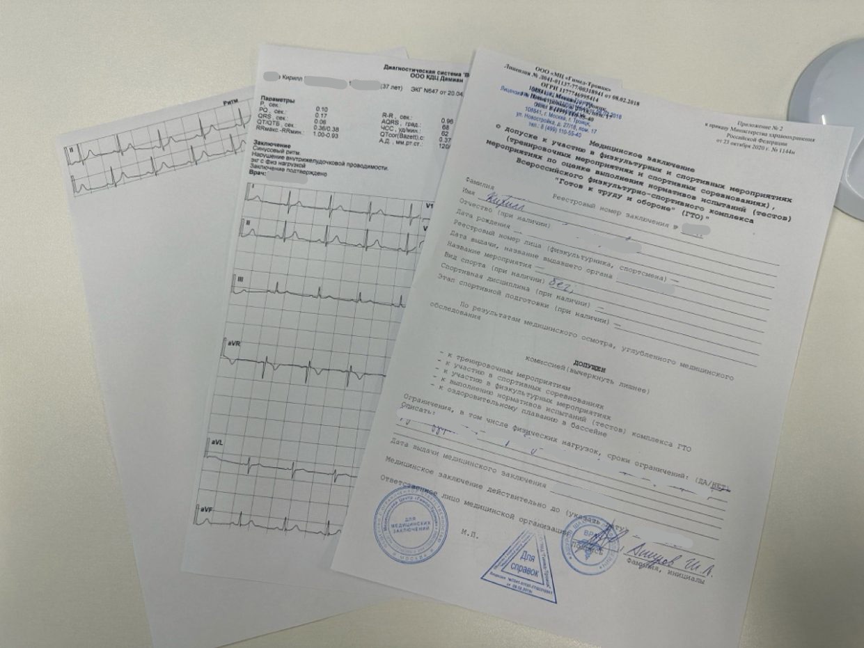 Так началась моя история со справками. Больничная палата, белые стены и аппарат ЭКГ – спутники любого серьезного атлета. Я прошел полный осмотр, результатом которого стали медицинское заключение и лента кардиограммы. Это стоило 3000 руб.