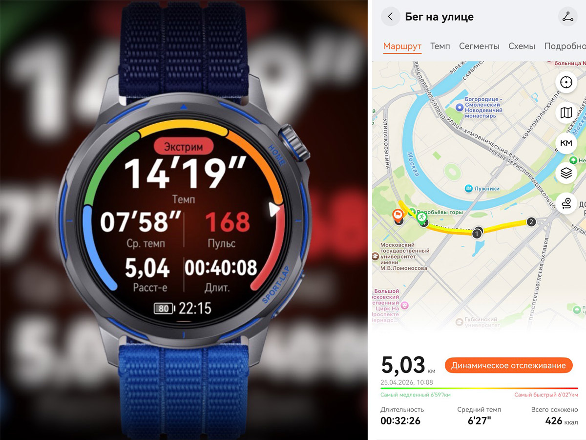 Маршрут на карте четко прорисовал мой путь вдоль набережной, мимо Лужников и Воробьевых гор. А ведь это зона, где гео постоянно сбоит. Но для часов со своим собственным GPS это не было проблемой.