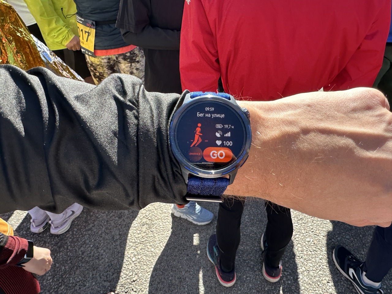 Часы быстро поймали спутники прямо среди толпы. Пульс в покое перед стартом составил 88 ударов, заряд батареи на уровне 96%, что обещало около 19,7 часов работы в режиме GPS. Уж точно хватит.