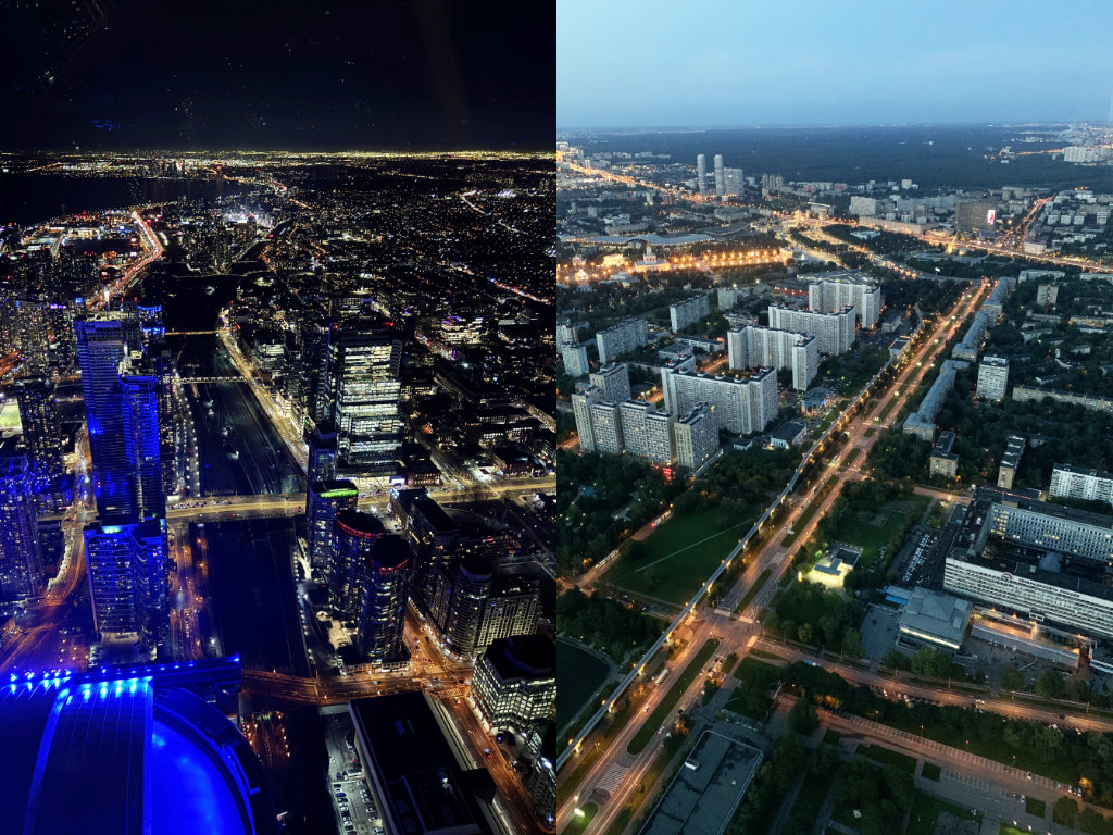 Слева ночной вид их Си-Эн Тауэр, справа из Останкинской башни.
