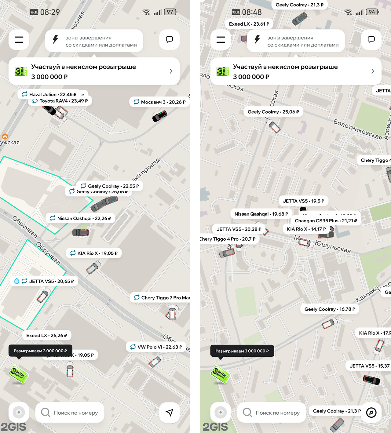 Самая дорогая машина, которую видел на карте за эти несколько дней, была Toyota RAV4 за 28 рублей в минуту. Самым дешёвым оказался Nissan Qashqai за 18 рублей в минуту.