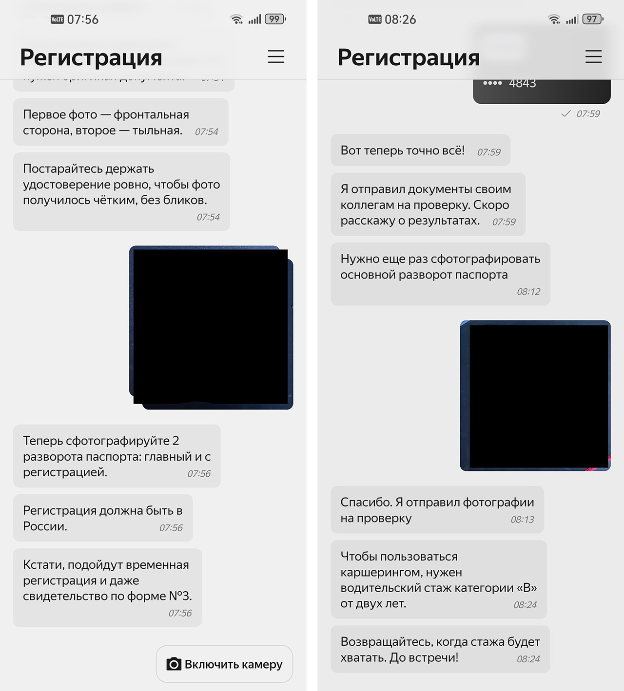В Делимобиле пришлось перефотографировать главную страницу паспорта 4 раза. Почему-то бот упорно не хотел распознавать её, утверждая что присутствуют блики и вообще ничего не видно, хотя фотографии делал аккуратно, под ярким освещением на столе и никаких бликов не заметил.