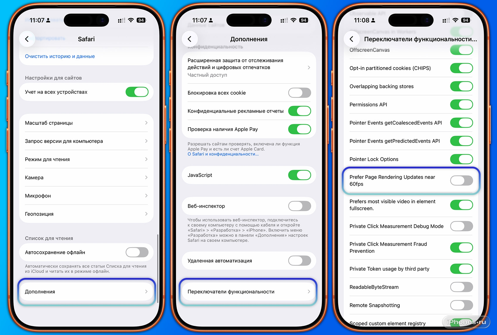 На iPhone есть несколько ограничителей частоты кадров экрана, и все они влияют на работу браузера Safari. Поэтому придётся залезть в несколько мест и поправить настройки.