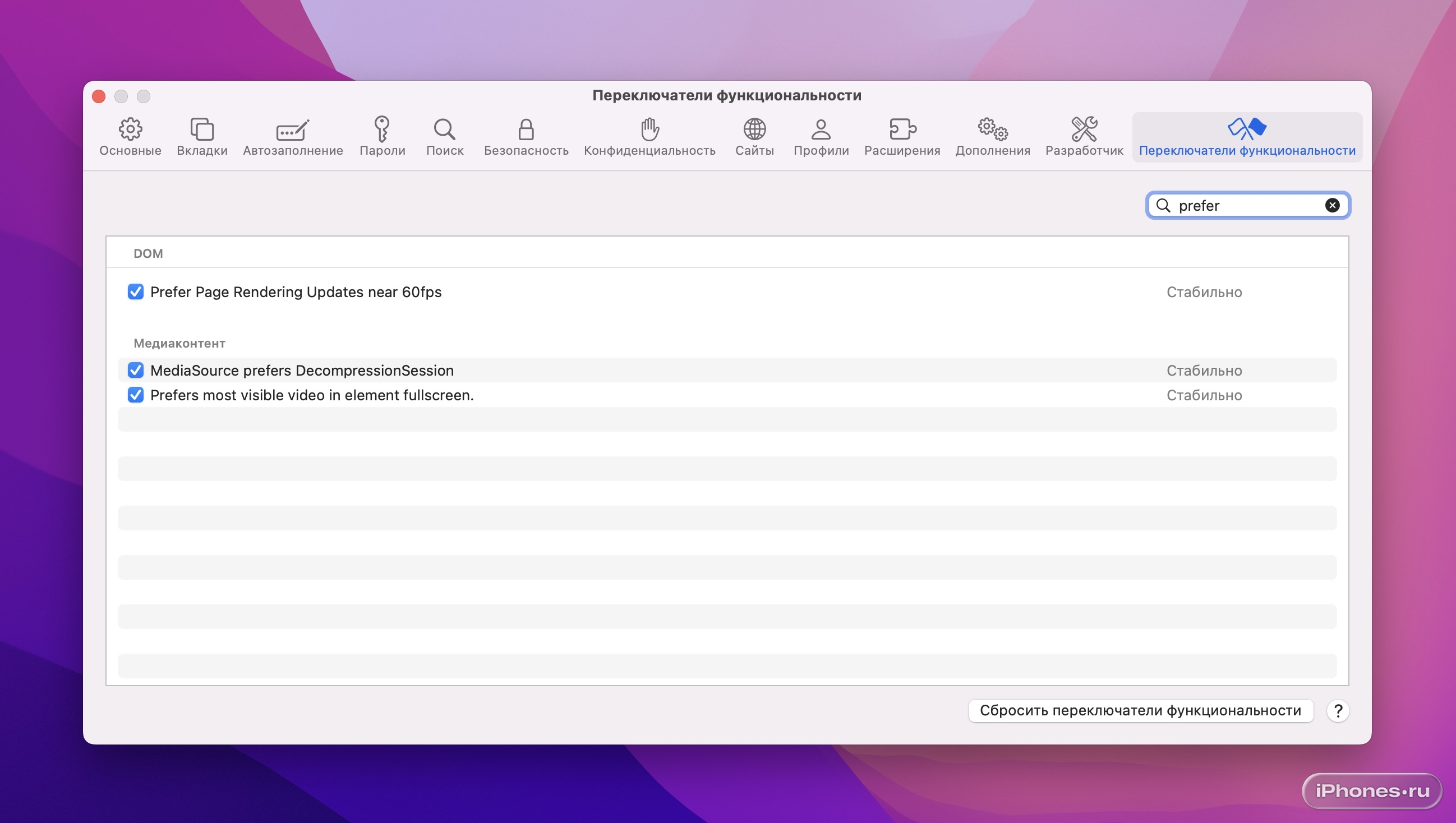 На Mac ситуация похожая. Там в Safari есть такой же переключатель, который старается держать обновление страницы ближе к 60 кадрам в секунду.