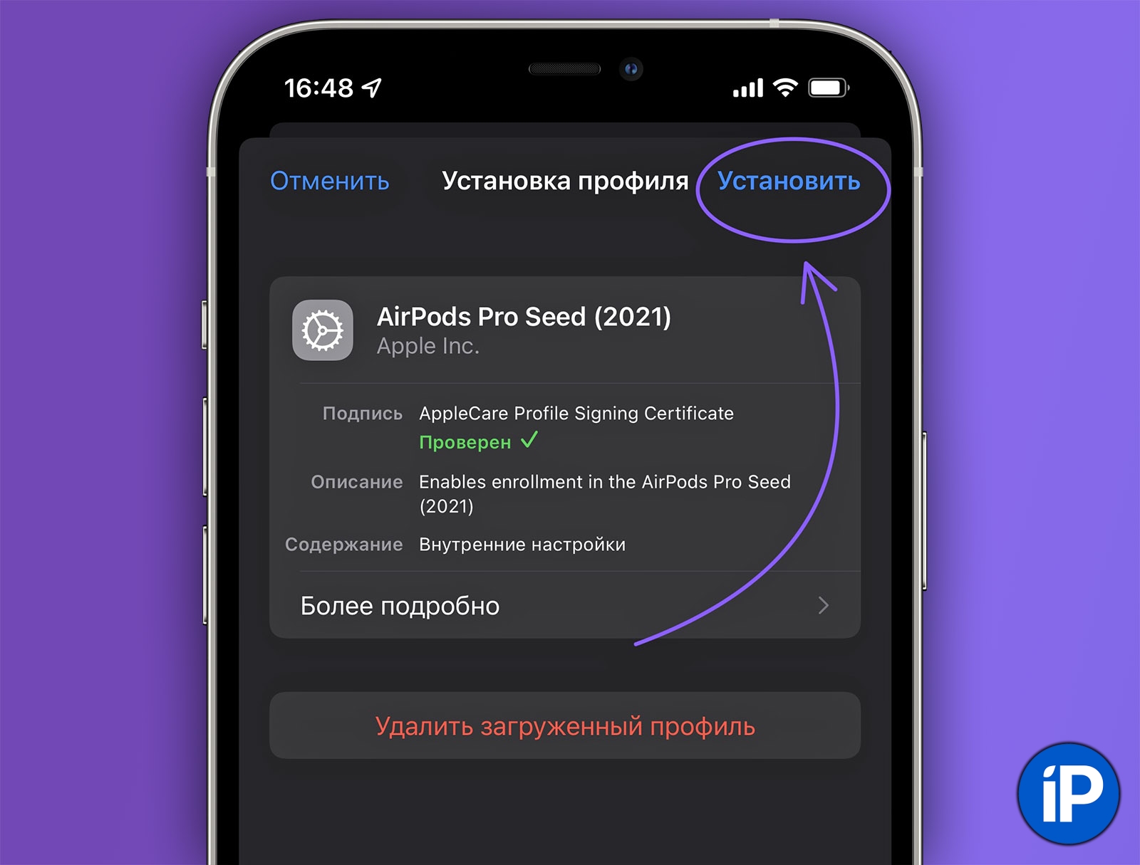 5. В меню профиля AirPods Pro Seed (2021) тапните на Установить и из предложенных устройств выберите iPhone.