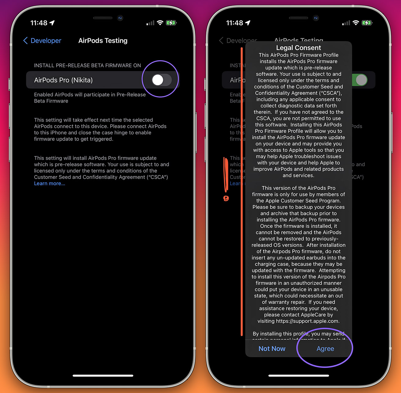 11. Это точка невозврата. Нажмите на переключатель напротив AirPods Pro. Прочитайте множество предупреждений. Это не шутки, наушники действительно можно сломать в ходе или после обновления.