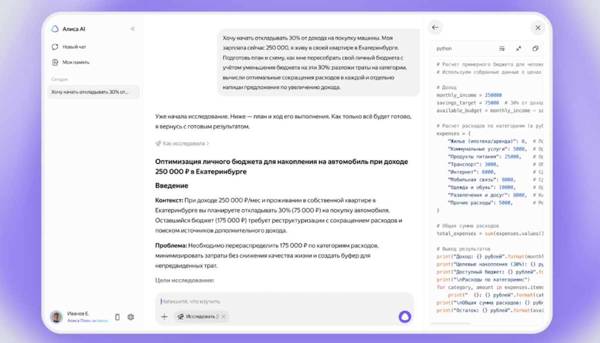 А если нужно проверить расчёты, то Алиса AI может написать код, запустить его и показать результат.