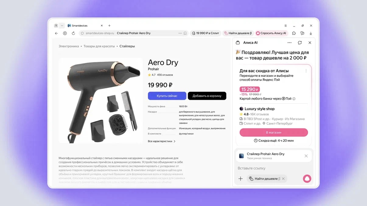 Пользователь отправляет в чат ссылку на товар, а Алиса AI подбирает варианты с низкой ценой среди предложений в интернете. Агент сравнивает продавцов от маркетплейсов до локальных сайтов, учитывает регион покупателя и показывает, где товар есть в наличии.