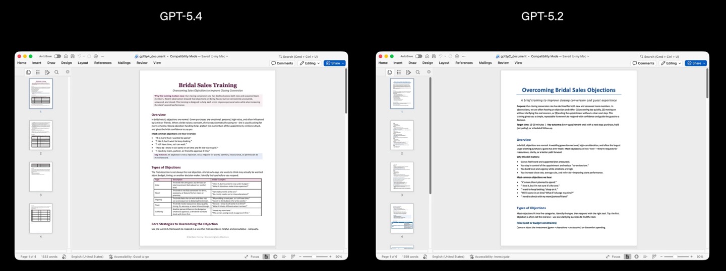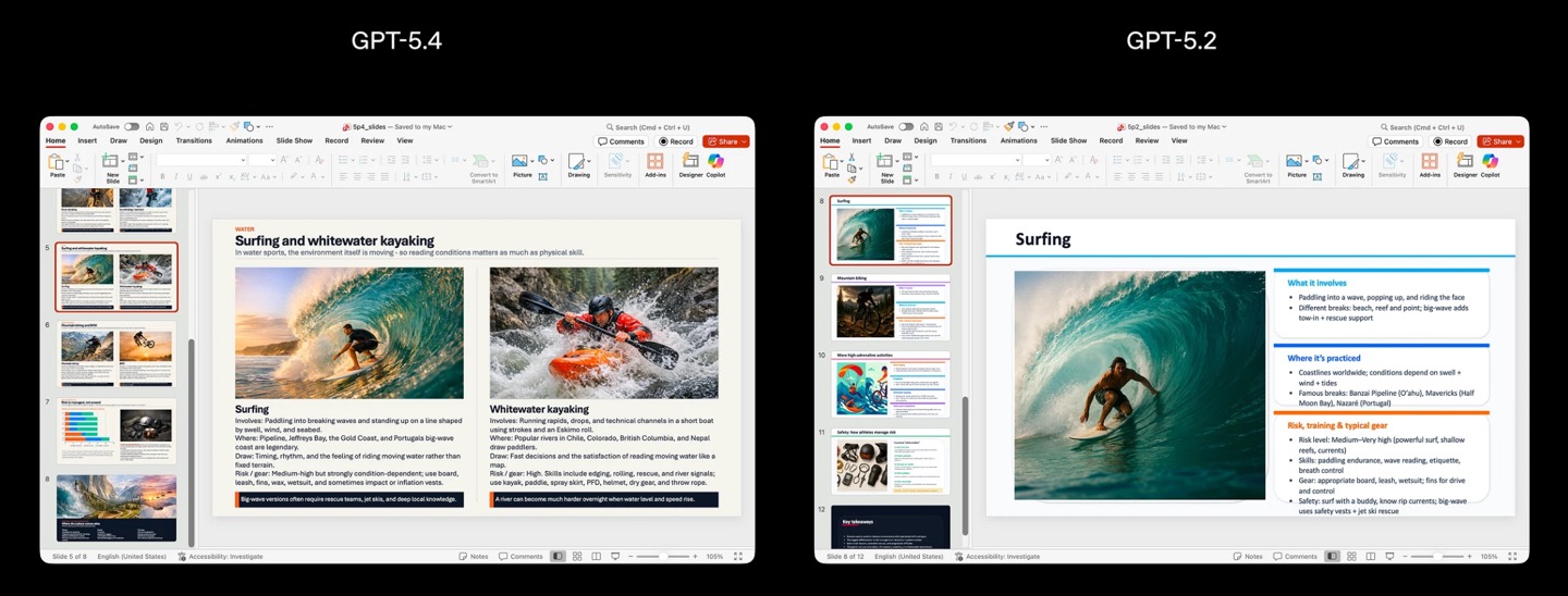 GPT-5.4 лучше справляется с созданием презентаций, таблиц и документов, чем GPT-5.2. Кроме того, OpenAI сильно прокачала агентный режим, благодаря чему GPT-5.4 может анализировать скриншоты, пользоваться браузером, выполнять действия мышью и клавиатурой и вызывать API и инструменты.