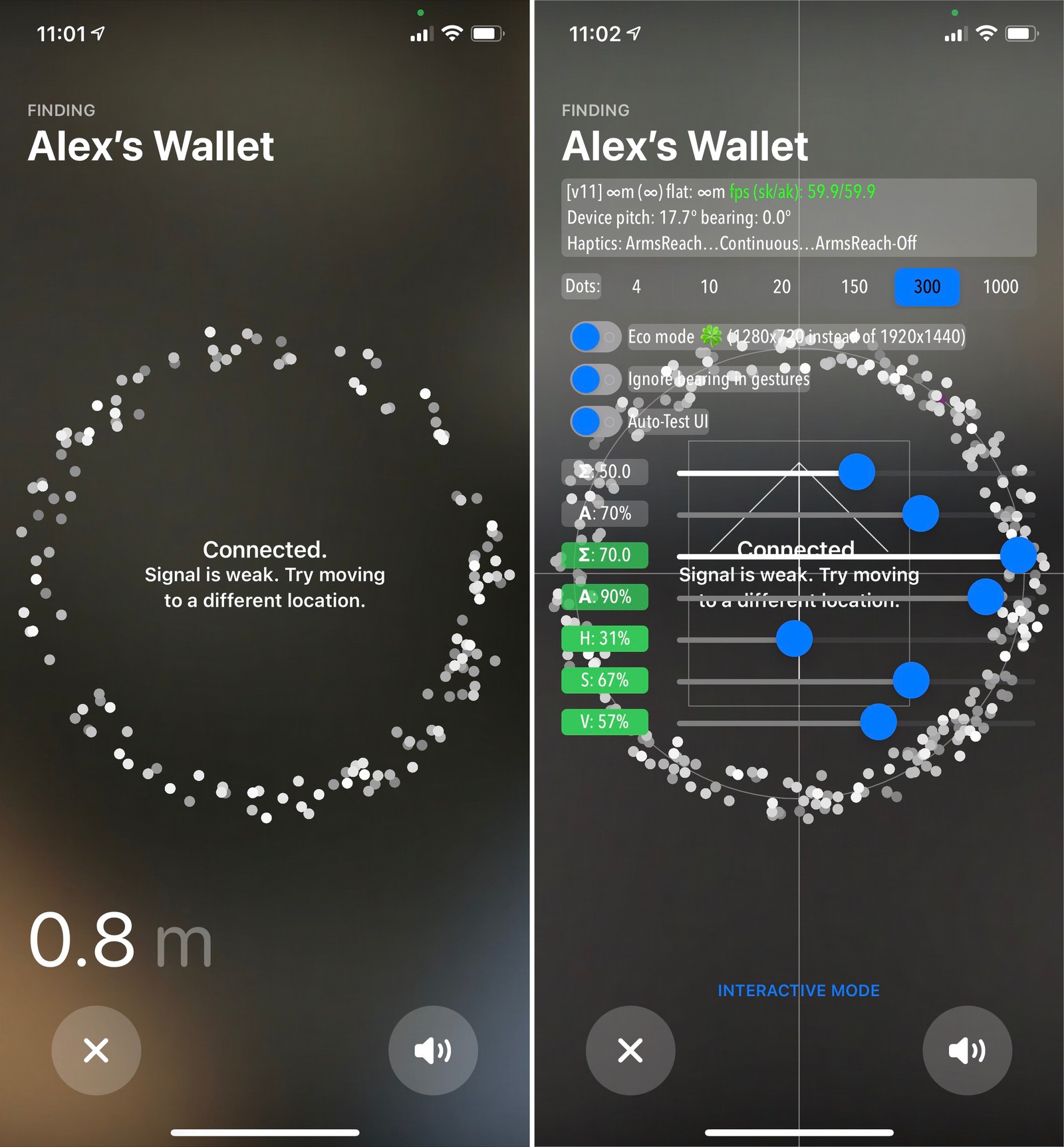 Увидеть такой экран можно после 4 нажатий на название вещи. В нем указывается диагностическая и техническая информация о работе Precision Finding в режиме реального времени, включая координаты акселерометра и гироскопа, тактильную обратную связь, разрешение экрана, анимацию отслеживания и многое другое.