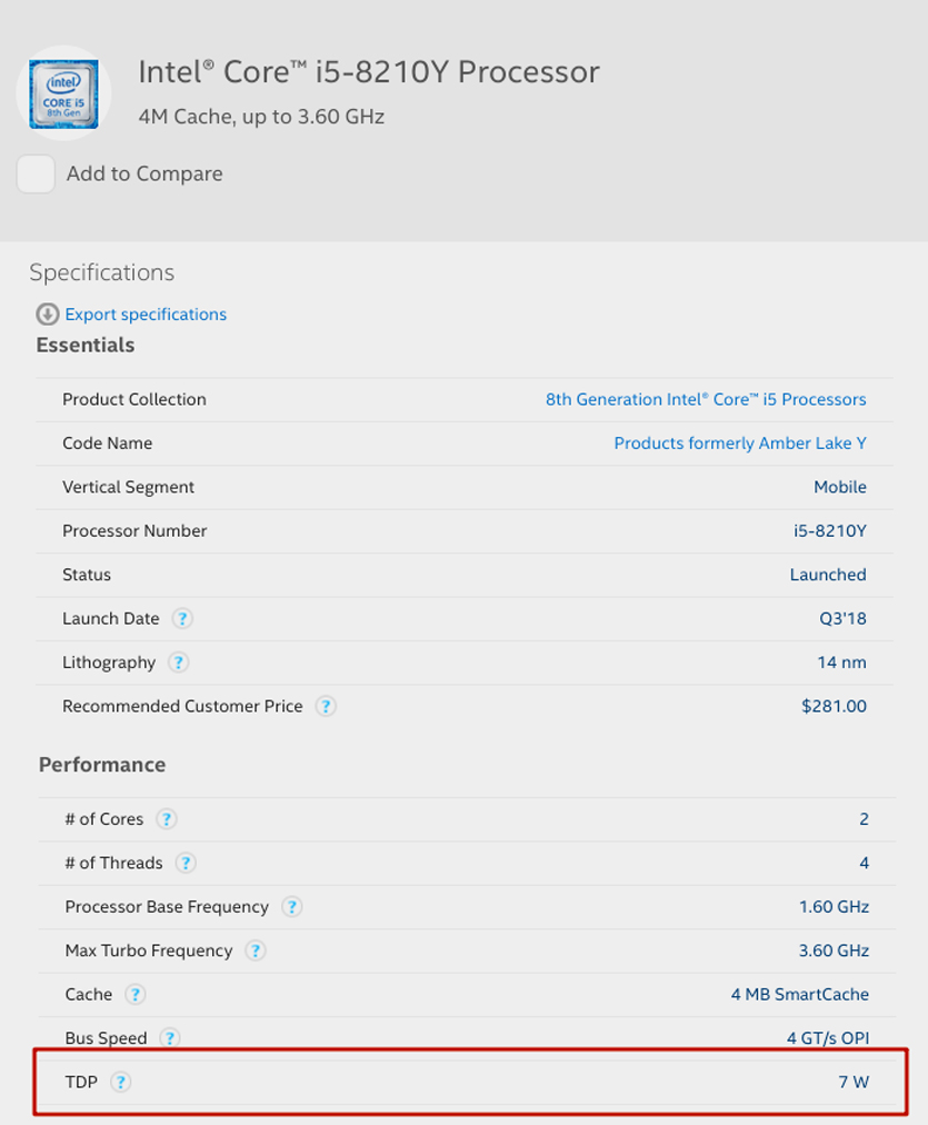 А все из-за такой характеристики как TDP, указывающей на тепловую мощность конкретного чипа. В новых MacBook Air значение TDP составляет 7 Вт. В Air прошлого поколения эта величина составляет 15 Вт, а вот в 12-дюймовых MacBook с пассивной системой охлаждения — всего 5 Вт.