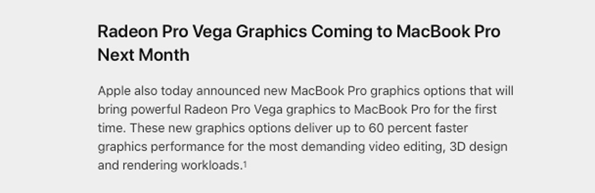 Сегодня мы также представляем новую опцию для MacBook Pro. Теперь пользователи впервые смогут укомплектовать свой ноутбук мощной графикой Radeon Pro Vega.