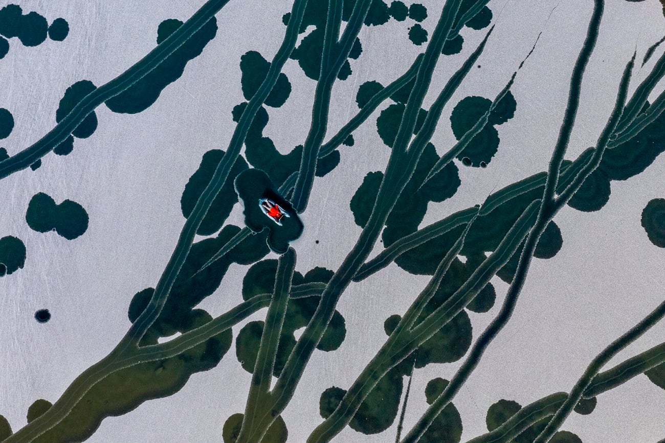 Фотография была сделана дроном над одним из горных озер Алтая. За один день озеро замерзло и покрылось небольшим слоем снега.