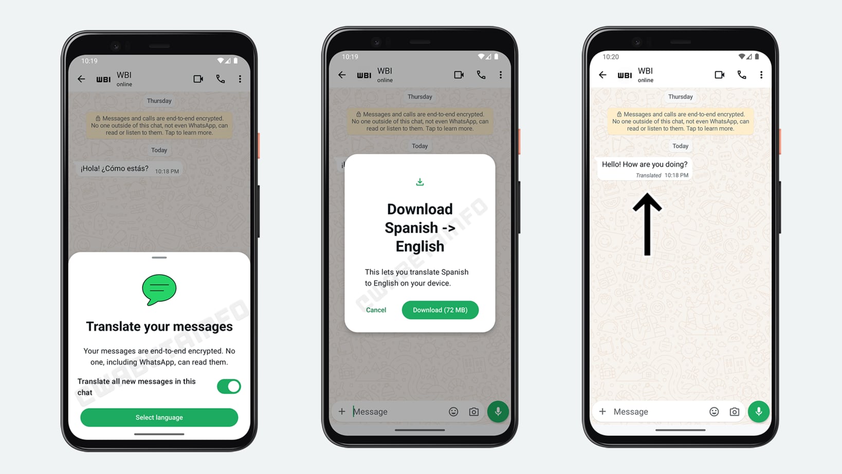 WhatsApp тестирует на Android встроенный переводчик сообщений, который может перевести всю переписку. После выбора языка необходимо загрузить языковой пакет для перевода (весь процесс происходит на устройстве). Рядом с переведенным сообщением показывается соответствующая отметка. Переводчик поддерживает следующие языки: английский, арабский, испанский, португальский, русский и хинди.