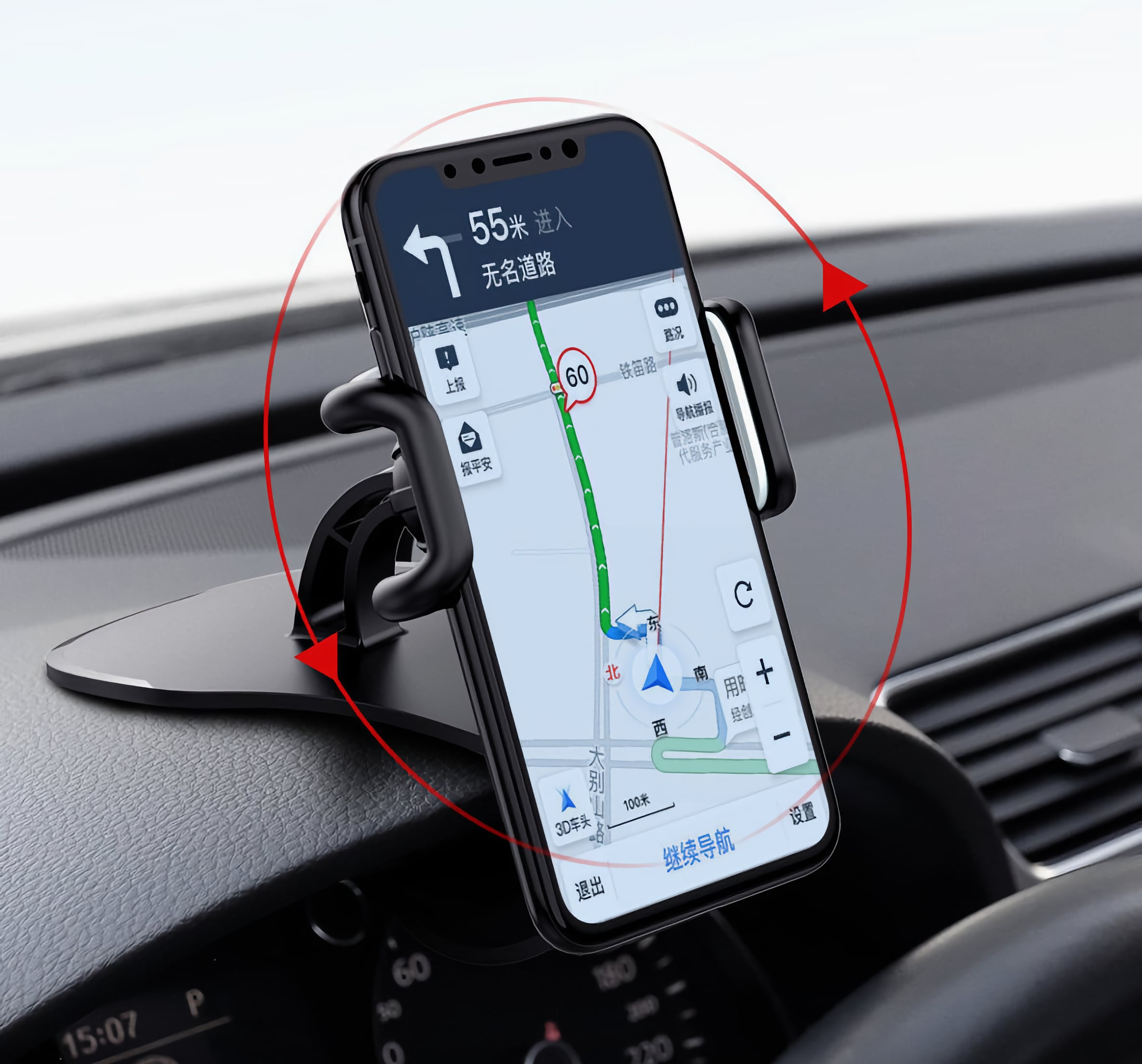 Смартфон в держателе можно размещать вертикально и горизонтально. Механизм вращается на 360 градусов.