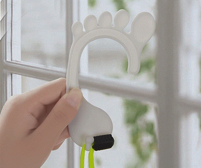 Устройство гениальное и простое до безобразие: шнурок и крючок в виде детской ножки.