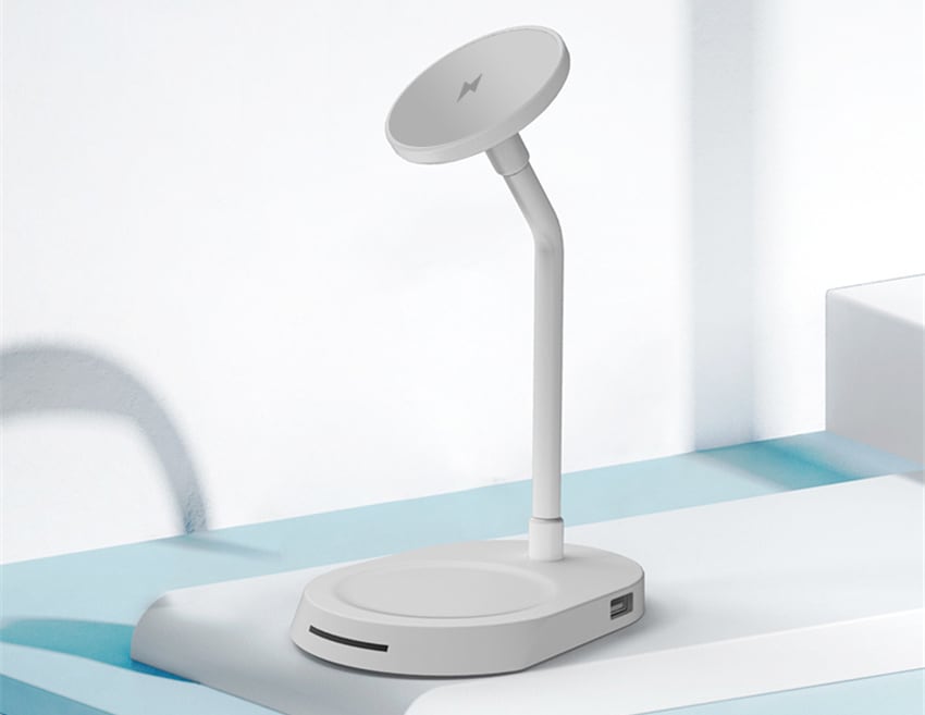 На площадке также установлена ножка с MagSafe для крепления iPhone 12 и 13, что очень редко встречается в бюджетных док-станциях. Крепление для смартфона вращается на 360 градусов.