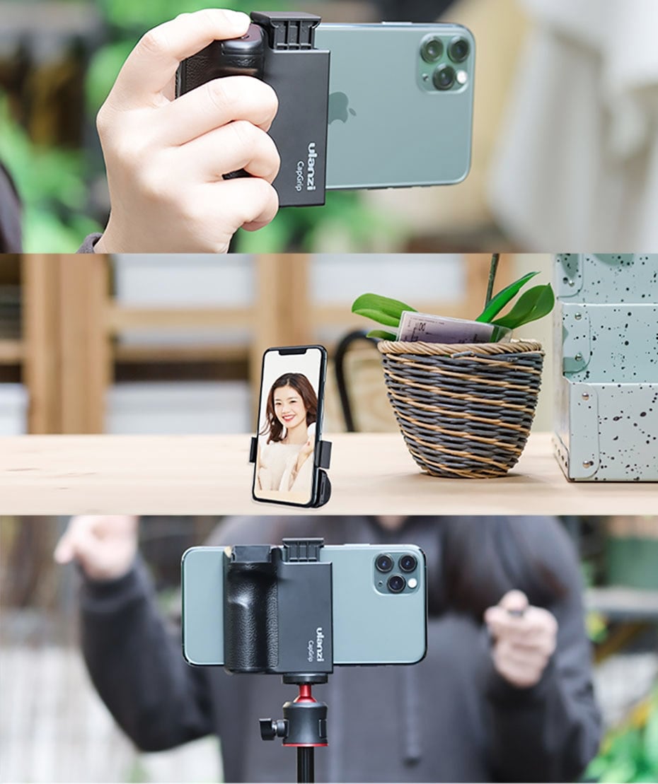 Снизу на грипе есть стандартное отверстие 1/4 для крепления штатива. Можно прикрепить смартфон на штатив и дистанционно управлять камерой с помощью Bluetooth-кнопки.