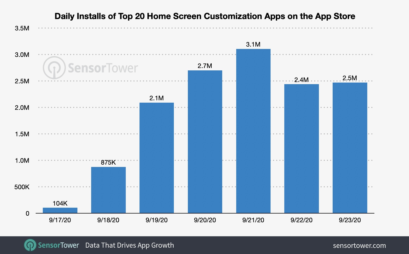 Одновременно с выходом iOS 14, в App Store появились приложения для создания виджетов. За неделю их скачали более 13 млн раз, согласно данным Sensor Tower.